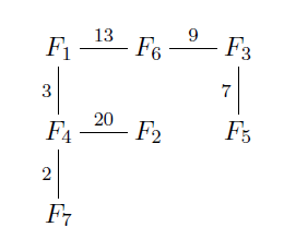 农夫约翰有N(2<=N<=40000)个农场,标号1到N。M(2<=M<=40000)条不同的垂直或水平的道路连接着农场,道路的长度不超过1000.这些农场的分布就像下面的地图一样,图中的农场用F1~F7表示:
